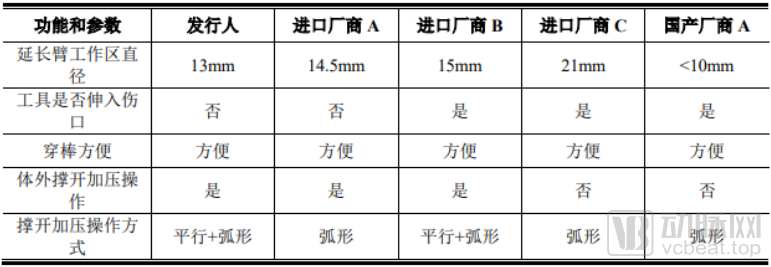 以半开口弹性臂经皮微创技术,威高医疗给出以下图表,表明发行人相关技术已较其他进口厂商实现相对较小的延长臂工作区直径,在证明了相关技术独特性的同时突出了技术的先进性。其他14项技术也采用相似的手段一一说明。