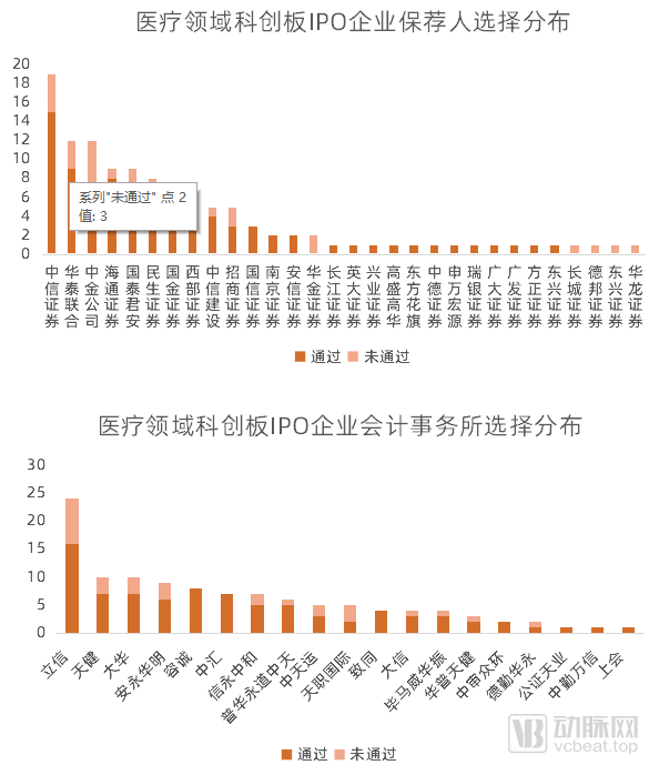 科创板开板以来总共112家医疗企业递交招股书,保荐人及会计事务所选择如上图所示(数据来源:动脉网;整理时间:2022年3月8日)