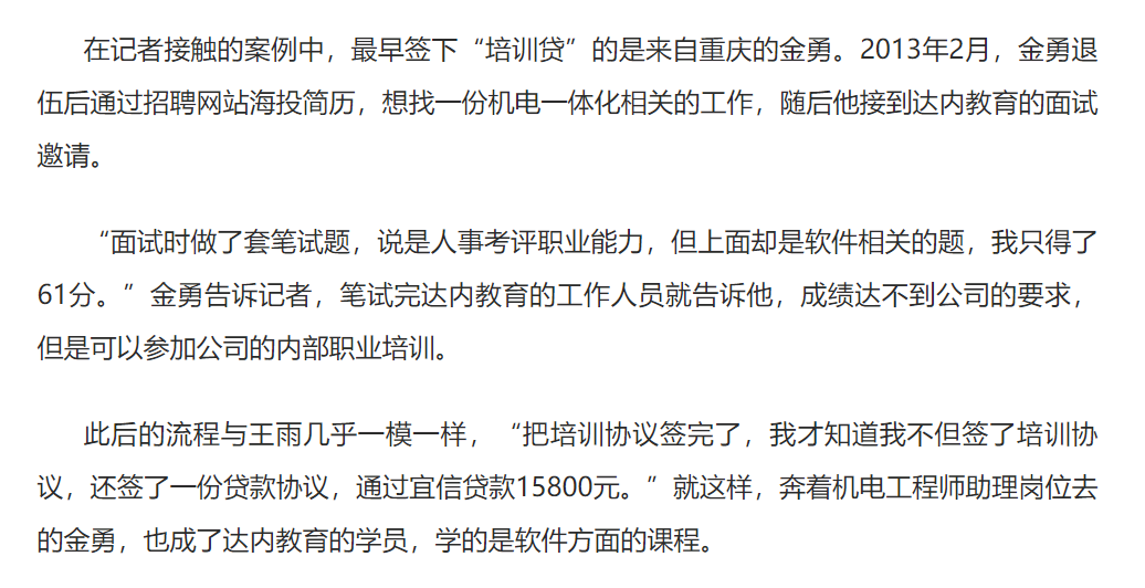 2019年,《证券时报》就曾报道过,2013年,号称亿元级职业教育集团达内教育(下称“达内”)利用消费贷款模式对应届生进行职业教育培训,次年,达内教育就在美国纳斯达克上市。