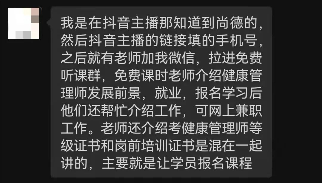 换句话说,尚德机构在丁雯报名营养师和健康管理师课程初期就已知其不具备健康管理师考试资格,用笼统的方式让丁雯考下了碰瓷证书。