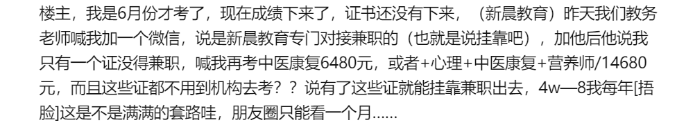 不仅如此,她所报名的营养师课程也是相同结局,她依然没有参与营养师资格证考试的资格,只获得了机构办法的技能培训证书。