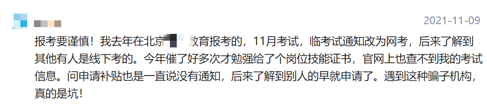 二者区别在于,后者获得的只是“岗位技能证”,全程只需要网上答题,并且考取后不能获得国家补贴,对求职也意义不大。“就好比大部分人要做老师,就必须考取国家认证的教师资格证,但我被拉去机构上了一段时间课,机构只给了我一张结业证书”,丁雯气愤地说。