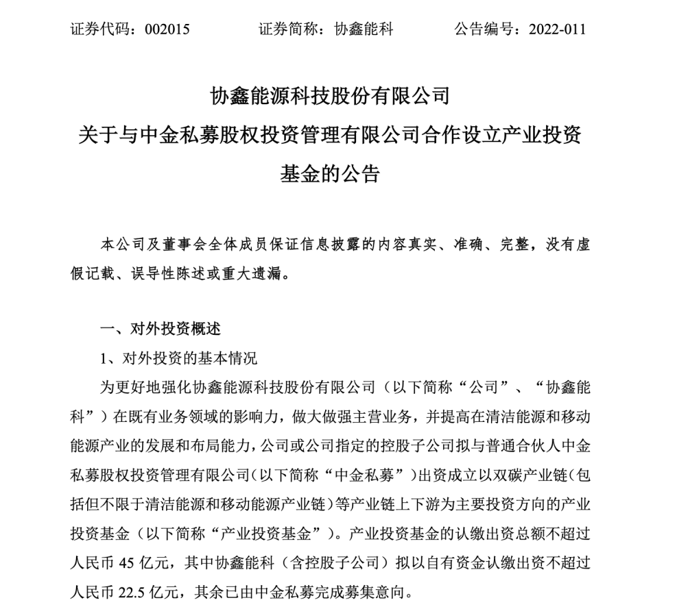 3月6日晚间,移动能源上市企业协鑫能科发布公告,公司与中金合作的百亿碳中和产业投资基金——中金协鑫碳中和产业投资基金,首期45亿元正式落地,其中协鑫能科(含控股子公司)拟以自有资金认缴出资不超过人民币 22.5 亿元,其余已由中金私募完成募集意向。