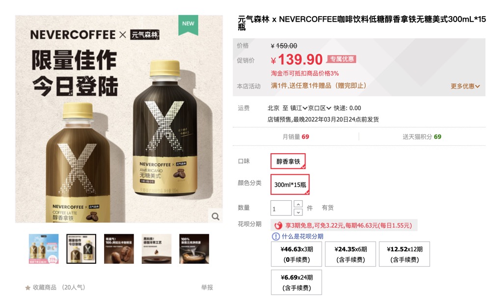 近日,元气森林和即饮咖啡产品Never Coffee联合推出两款咖啡产品,分别是无糖美式和低糖醇香拿铁。目前,这两款产品正在元气森林天猫旗舰店销售,每箱价格139.9元,包含15瓶,每瓶300ml。