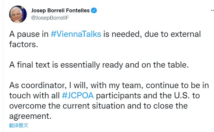 上周五,欧盟外交与安全政策高级代表博雷利宣布由于“外部因素”,维也纳谈判需要暂停。目前代表们已经返回各自国家,谈判何时重启尚不得知。
