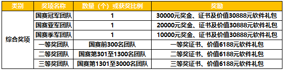 国赛冠军团队获30000元奖金及证书;国赛亚军团队获20000元奖金及证书;国赛季军团队获10000元奖金及证书,国赛冠亚季军团队成员均可获得价值30888元的软件大礼包一份。