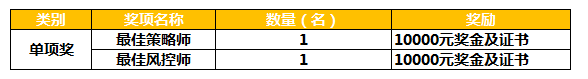 省赛及国赛阶段,策略师和风控师按照要求分别定期提交策略报告和风控报告,由大赛组委会评选最佳策略师和最佳风控师各一名,分别获得10000元奖金及证书。