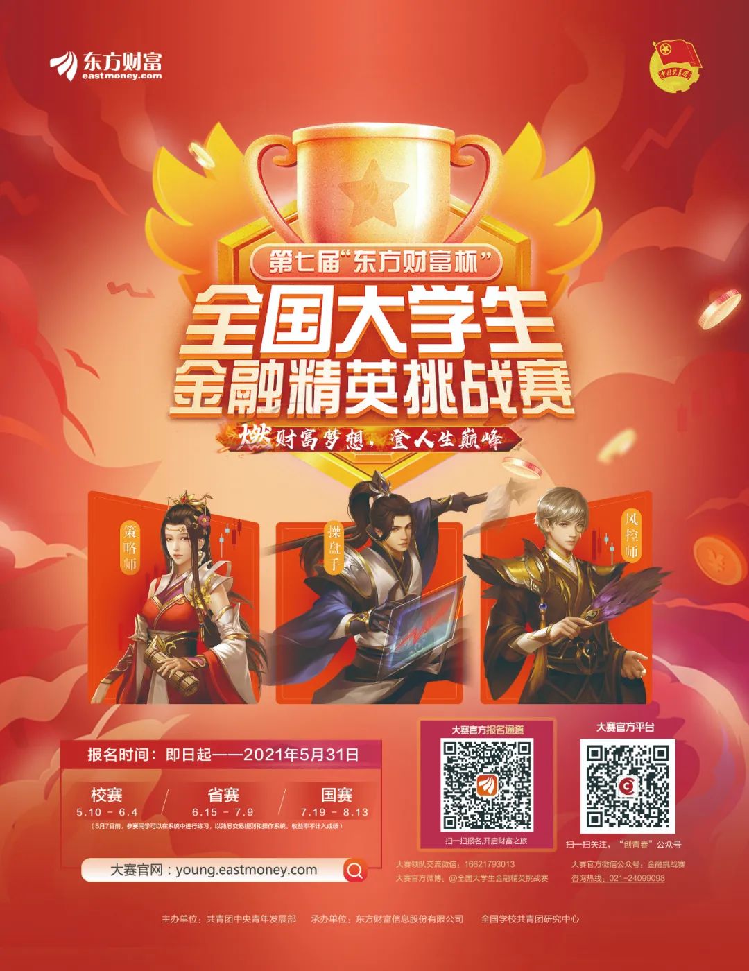 第七届“东方财富杯”全国大学生金融精英挑战赛分为校赛、省赛和国赛三个阶段。参赛学生及团队使用大赛专用平台,以沪深上市的A股品种进行比拼。