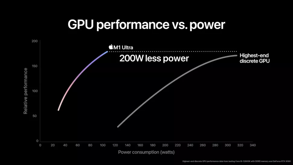 而相比英伟达旗舰3090显卡,实现同样性能,M1 Ultra的功耗少了200W。
