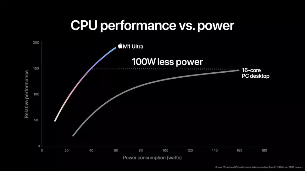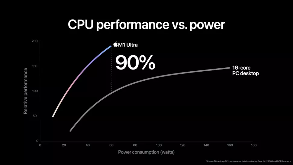 根据苹果给出的数据,相同功耗下,M1 Ultra的多线程性能,领先隔壁16核台式机芯片90%。