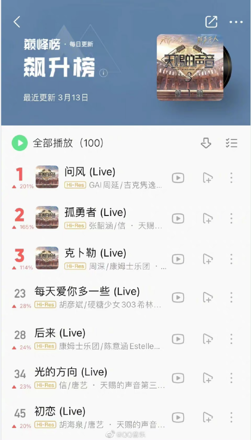 之所以腾讯音乐将目光锁定到音综版权方面,主要是因为节目的播出可以直接带动这些音乐的播放,从而带动音乐平台的点击量。像是在3月13日的QQ音乐飙升榜中,出现在第一期《天赐的声音3》中的《问风》《孤勇者》《克卜勒》三首歌占据飙升榜的前三位。