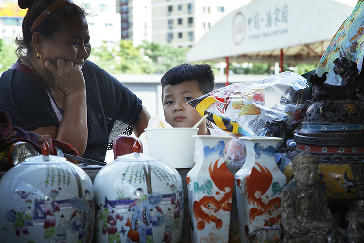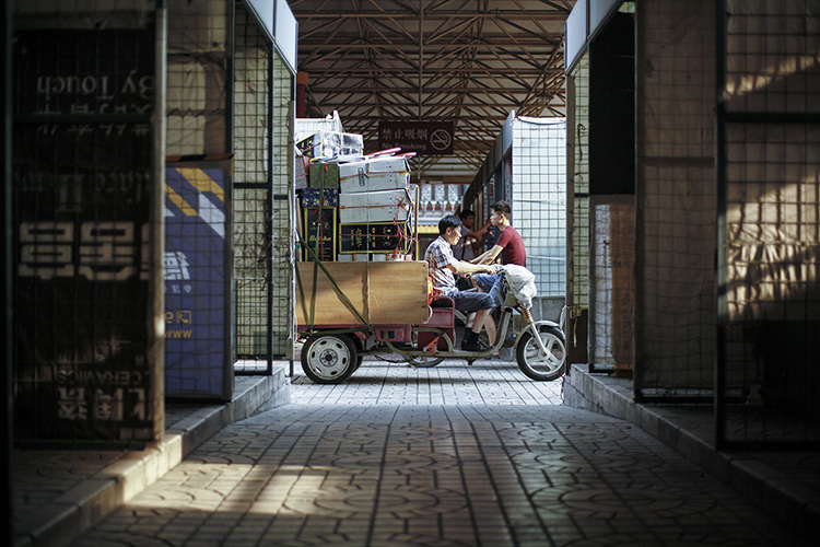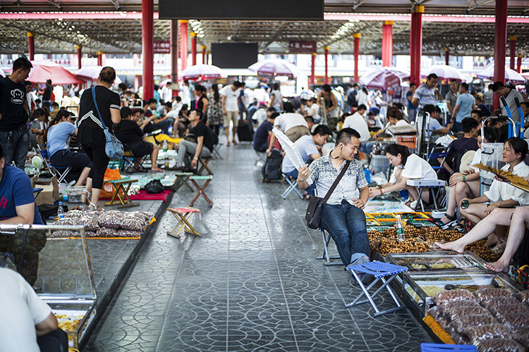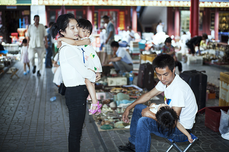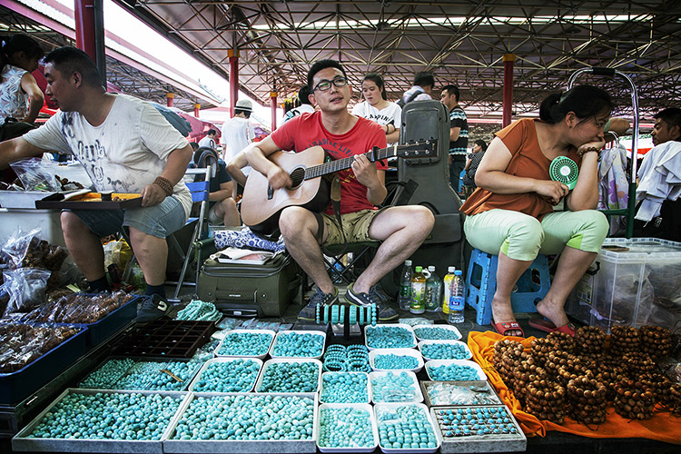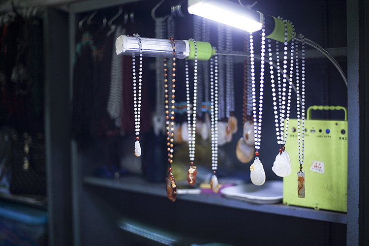 6月下旬的北京,地面温度近40度。康珠早已习惯了露天商铺的冬寒夏炙。在靠近市场东门的二区地摊上,她眯着眼睛,一边拿线串起带有图腾图案的黑白纹理的藏珠,一边和一个耄耋老者聊天。