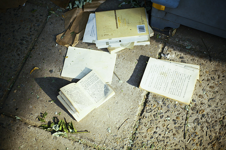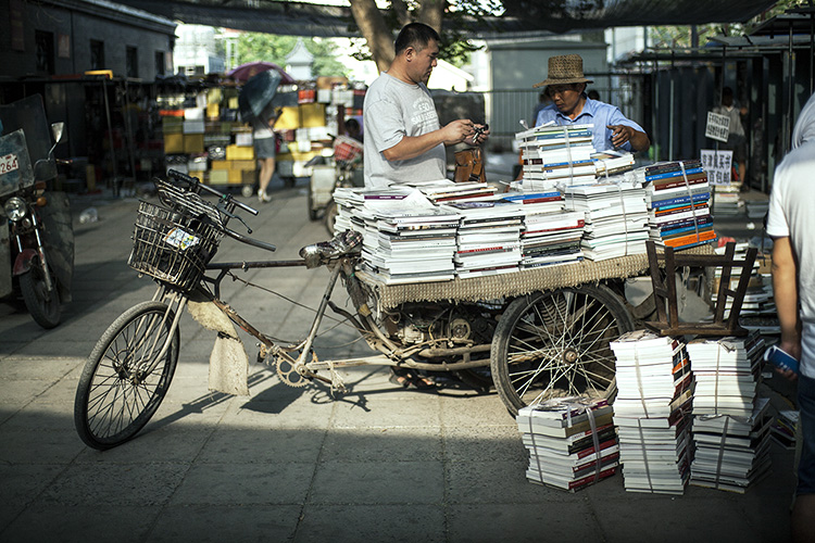 市场南边的一窄条地方,面对面立着一人多高的200多个铁皮货柜。这些货柜属于书刊商户们,他们只在人流量较多的周六日出摊,周一到周五则选择在手机上用微信推广和网店做买卖。