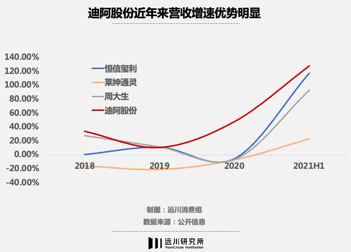 对比与DR竞品关系直接的 I DO,在DR母公司迪阿股份营收大幅增长的年份,I DO 母公司恒信玺利的增长疲软,甚至出现了负增长。以同期可比数据来看,截至2021年上半年,迪阿股份的营收是恒信玺利的2倍(23.2亿元 VS 10.8亿元),但迪阿股份的全国门店数量仅约后者的一半(375家 VS 717家)。