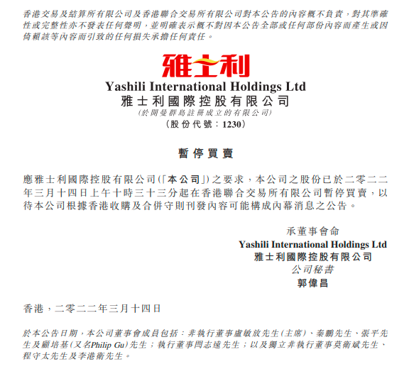 刚刚,在香港上市的雅士利国际发布了最新公告,称公司从2022年3月14日上午10时33分起在香港联交所暂停买卖,以待“根据香港收购及合并守则刊发内容可能构成内幕消息之公告”。