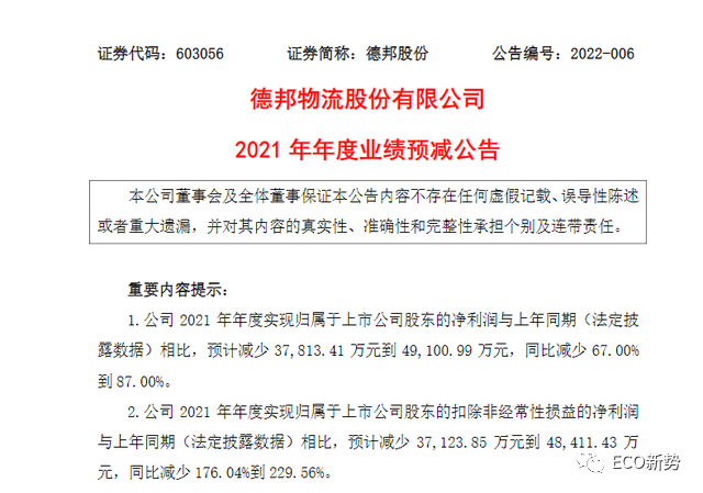 停牌前,根据德邦股份披露的2021年年度业绩预减公告,2021年其净利润同比预减少3.78亿元-4.91亿元,下降幅度达67%-87%,扣非归母净利润将降低至约-1.6亿元至-2.73亿元。