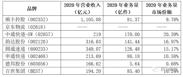 无论是市值、营收、业务量数据,上市后德邦并没有改变后来者的行业地位。在营业收入方面,八家快递系上市公司中,以2020年的全年数据看,顺丰营业排在第一,收入1105.08亿元,其次分别是圆通速递349.07亿元、韵达股份316.63亿元、中通快递219亿元,德邦仅为166.62亿元。在市场份额方面,八家快递系上市公司中,德邦股份为0.68%排名垫底,较2018年的0.88%进一步下滑。