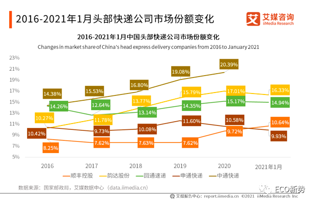 艾媒咨询数据显示,2021年1月,顺丰控股、韵达股份、圆通速递、申通快递的市场份额分别为10.64%、16.33%、14.94%、9.93%。