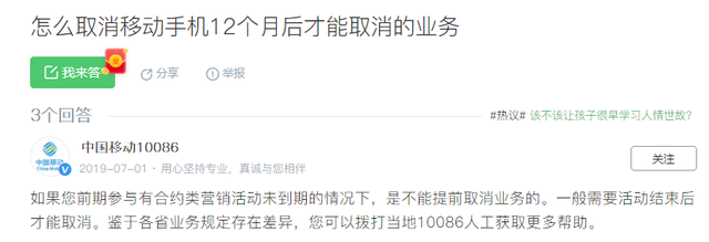 百度知道上类似问题的提问下,10086现身说法,亲自授课:前期参与有合约类营销活动未到期的情况下,不能提前取消业务。一般需要活动结束后才能取消。鉴于各省业务规定存在差异,可以拨打当地10086人工获取更多帮助。