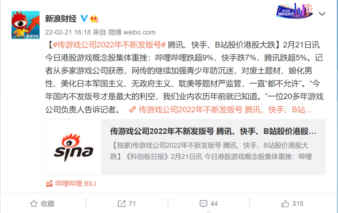 白贝看到新闻时也蒙了,毕竟他刚刚得到的消息是版号马上就要来了。白贝很担心,于是疯狂地向其他老板询问,但并没有问出个所以然。毕竟发布信息的报纸名字就叫科创板,当天游戏股的表现也都不出意外的难看,B站和快手的股价跌幅都超过了5%。