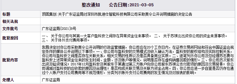 但诸多不规范处引起了有关部门的注意,经深交所及证监会多次问询、反馈之后,顶固集创对凯迪仕的收购事项最后以叫停告终。