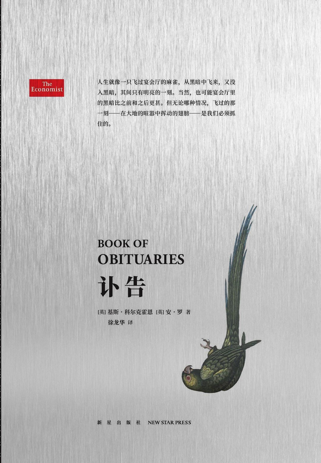 《经济学人》在讣告撰写领域出类拔萃,除了一千个单词的长度外,这一文体没有任何写作限制。《讣告》一书收集了《经济学人》杂志讣告栏中自1995年开办到2008年的201个生命故事,其中的人物既有戴安娜王妃、导演黑泽明、作家索尔·贝娄这类名流贵族,也有寂寂无名的小人物,比如花园里的跳蚤专家,还有人类之外的报道对象,比如一只非洲灰鹦鹉。阅读讣告是了解一个领域、一个时代的历史,也是打开一个个体的生命之门——短短的文字不仅是对死亡的宣布,也可以是对生命的庆贺。