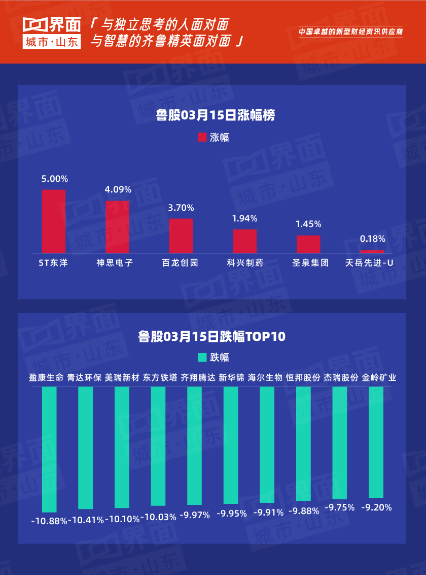 3月15日,山东省内沪深股票有6只个股上涨,258只个股下跌;总市值过千亿的有万华化学(600309)、海尔智家(600690)、兖州煤业(600188)、歌尔股份(002241)、青岛啤酒(600600)、潍柴动力(000338)、中航沈飞(600760)共7家,500亿-1000亿的共有3家,分别是山东黄金(600547)、华鲁恒升(600426)、中泰证券(600918)。