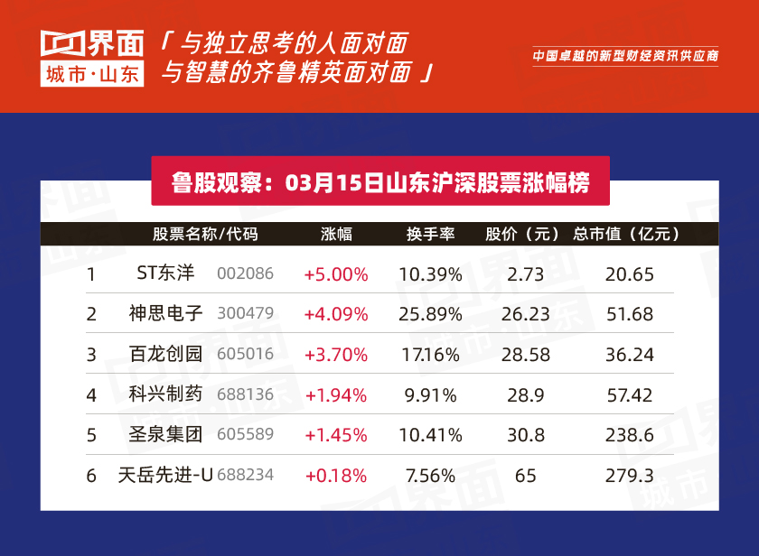 烟台市涨幅榜首:ST东洋(002086),涨幅5%,股价2.73元,总市值20.65亿元;