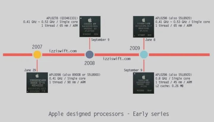 之后苹果APL0278、APL0298和APL2298三款芯片分别基于三星的65nm、65nm和45nm工艺,被用于二代iPod touch、iPhone 3GS、iPhone 3GS及三代iPod touch上。