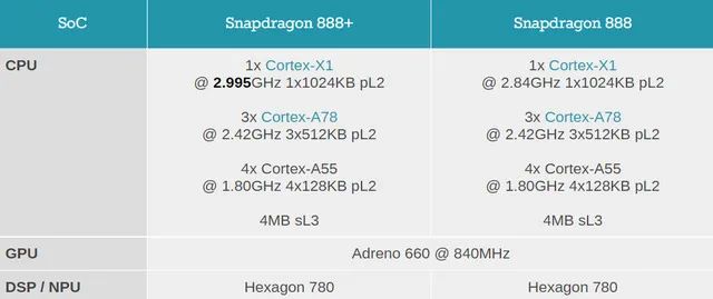 ▲高通骁龙888和888+的参数(图片来源:AnandTech)