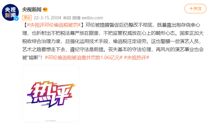 据@央视新闻 ,邓伦被提醒督促后仍整改不彻底,既暴露出抱存侥幸心理,也折射出不把税法尊严放在眼里,不把监管权威放在心上的畸形心态。国家正加大税收综合治理力度,且强化运用技术手段,偷逃税注定徒劳。这也警醒一些演艺人员,艺术之路要想走下去,遵纪守法是前提。丧失基本的守法伦理,再风光的演艺事业也会被“熔断”!