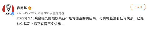 3月15日晚间,肯德基官方微博发布声明:2022年3.15晚会曝光的插旗菜业不是肯德基的供应商,与肯德基没有任何关系,已经勒令其马上撤下官网不实信息。