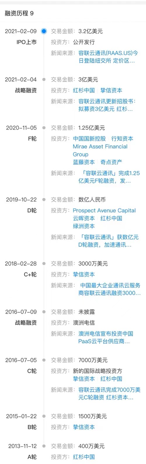 界面新闻查询天眼查获悉,在容联云通讯背后,是红杉资本、挚信资本、国新控股、云晖资本等明星机构的加持。其中,红杉资本自该公司2013年就开始投资,首批投资额400万美元;此后分别于2019年、2021年继续增资,到荣联云通讯美股IPO前的持股比例已达20.75%。