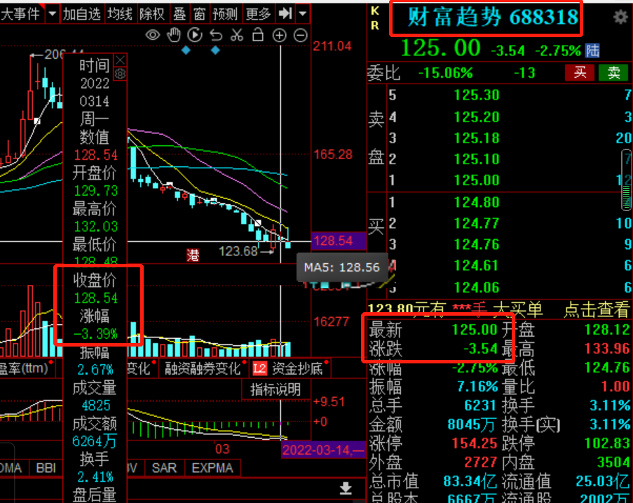 截止3月15日晚间收盘,财富趋势最新报价125元/股,跌幅3.54%,前一日收盘,跌幅3.39%。