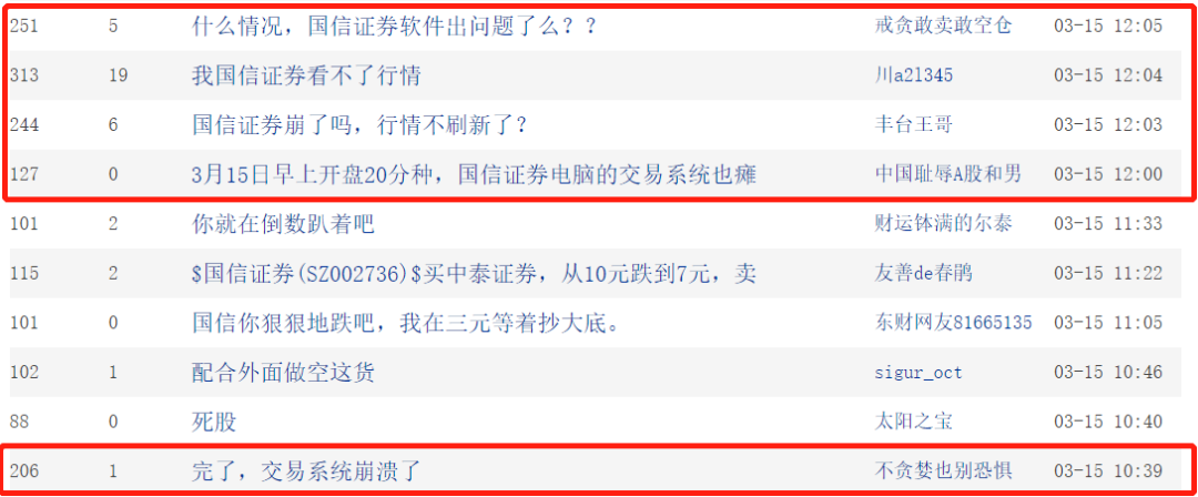今日,一些投资者在东方财富股票社区反映称,国信证券的交易系统开盘20分钟出现故障,此时正值大盘暴跌之际。