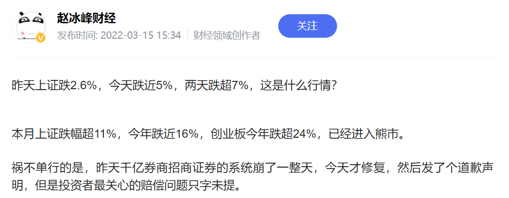 这次故障,也引起了部分投资者恐慌和不满。譬如财经自媒体人赵冰峰发文称,“我昨天卖了一半,今天一开盘就清仓剩余股票了。我不知道有多少招商证券的投资者和我一样,会选择离开这家券商,我相信肯定有部分人和我一样……我期待着招商证券还有后续的动作,而不是就这样悄无声息的结束了。”