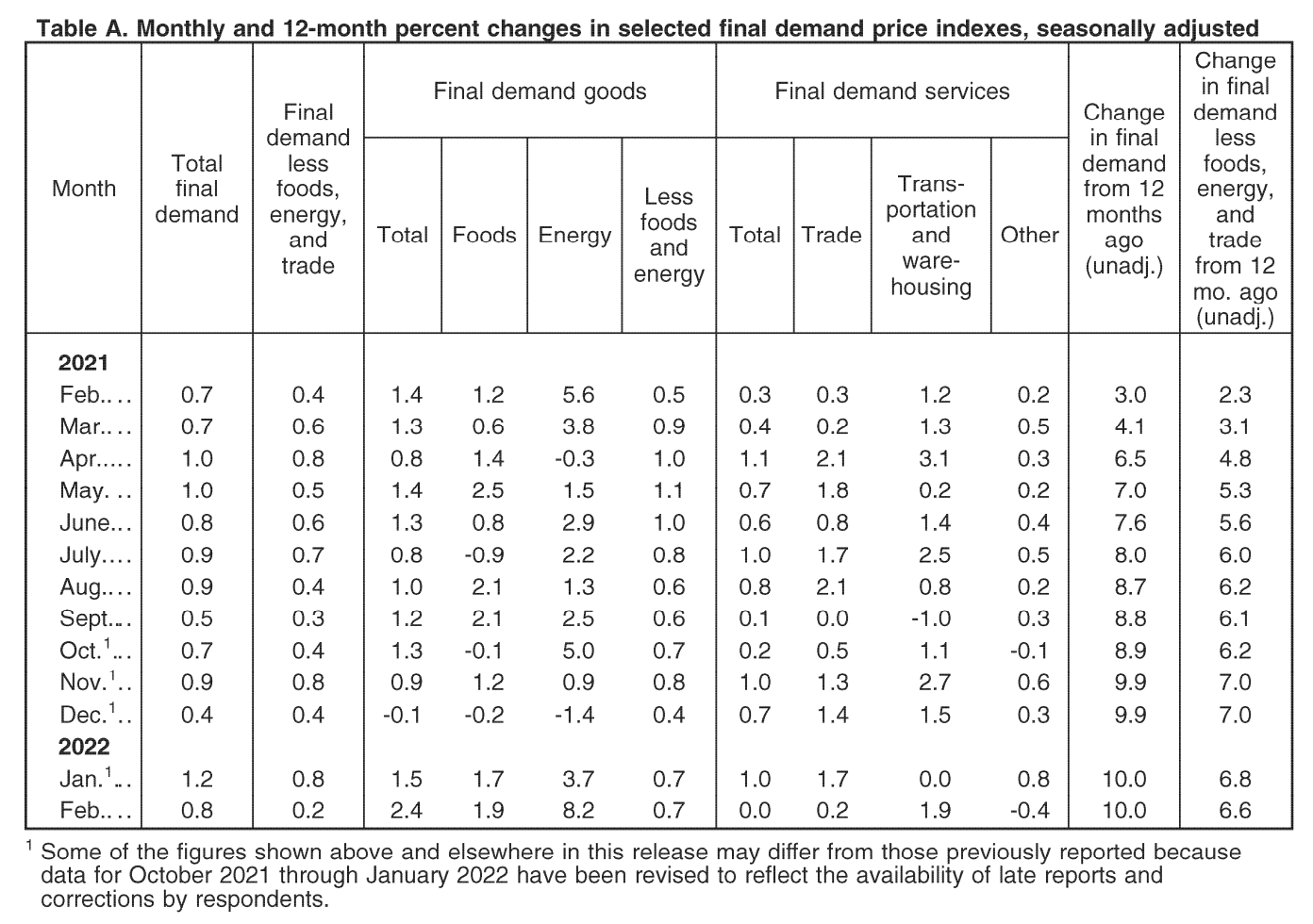 接受彭博社调查的经济学家此前预计,2月PPI同比增长10%,环比涨0.9%。