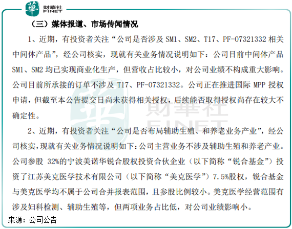 到了3月12日,美诺华在股价异常波动公告中表示,公司目前中间体产品SM1、SM2均已实现商业化生产,但营收占比较小,对公司业绩不构成重大影响。
