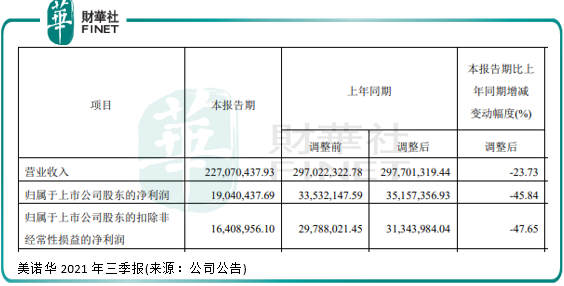 在2021年三季度,美诺华营收同比下滑23.73%至2.27亿元,净利润更是大幅下降45.84%至0.19亿元。