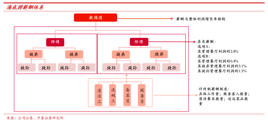 按照师徒制的设计,海底捞门店的店长,也是师傅,不断将员工(徒弟)培养成一名名准店长。徒弟就任新开门店店长之后,师傅会获得新门店利润的提成;等“徒孙”任新店店长后,“师爷”也能获提成。