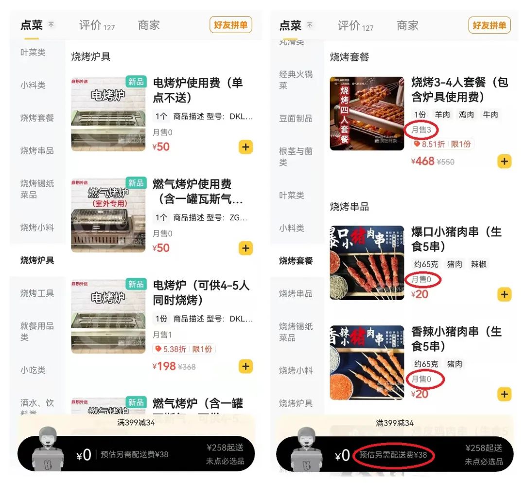 美团上的海底捞外送店铺页面显示,租一次烧烤炉的使用费为50元,而配送费达到了38元。3月11日,即海底捞推出烧烤业务约一周后,雪豹财经社在海底捞三元桥店的美团页面看到,售卖数量最多的是烧烤套餐,但月售仅3份,很多烧烤串品月售为零份。