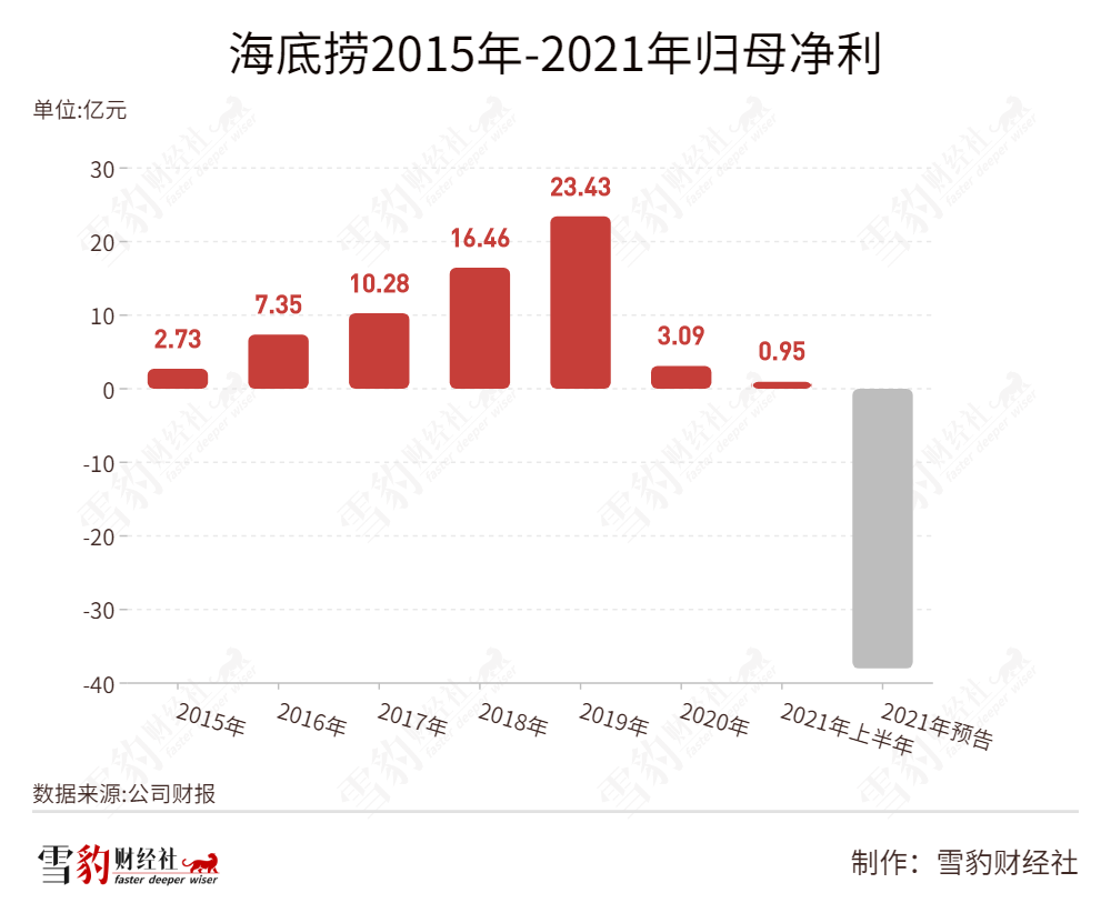 表面上看,目前海底捞面对的最大问题,是1月21日公告中预警的上市以来首次亏损:2021年净亏损约为38亿元至45亿元人民币。这相当于此前3年半利润的总和。