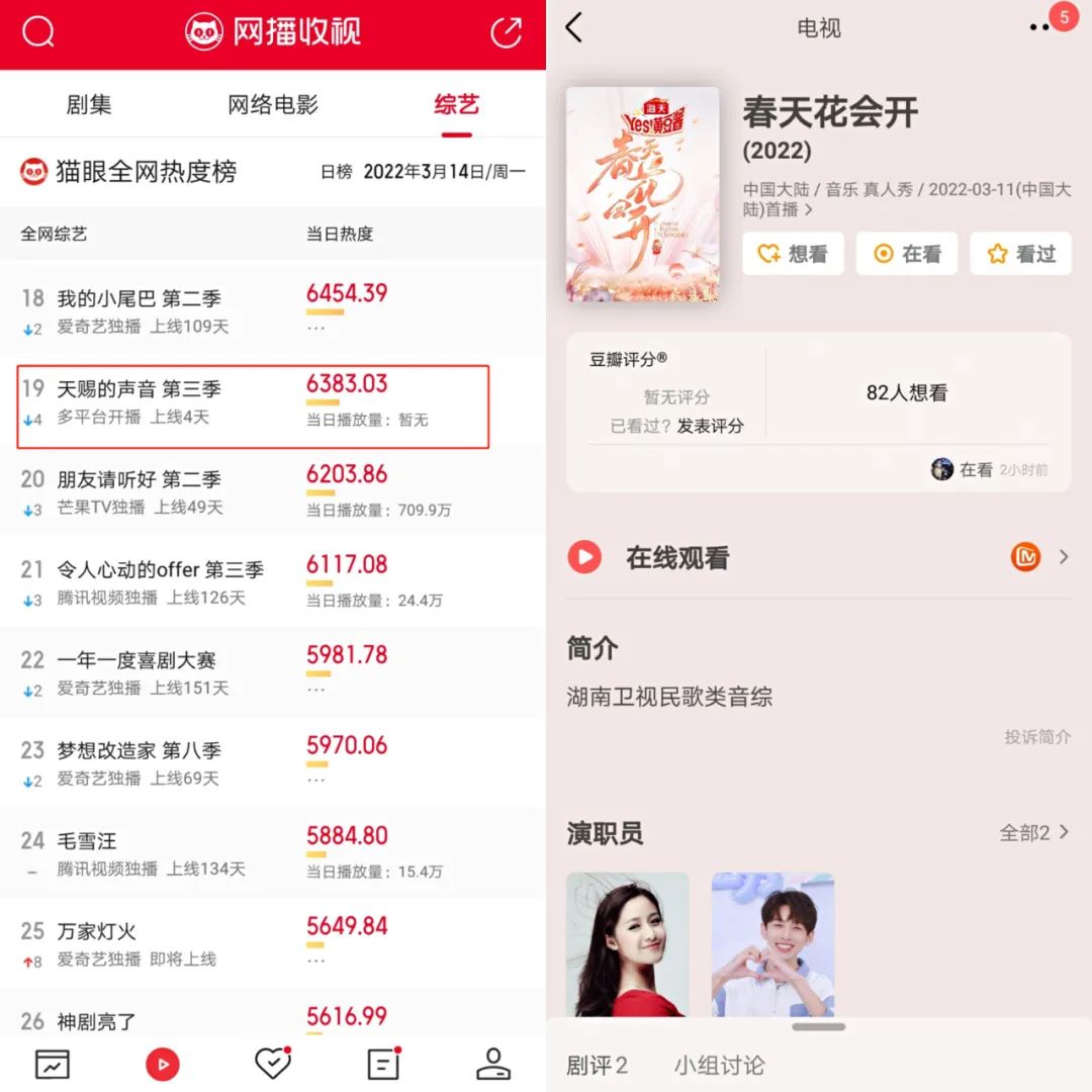 猫眼数据显示,三档节目虽在播出后都进入过综艺热度榜TOP5,但随后热度迅速下滑,截至目前,《天赐的声音》第三季一度跌至榜单第19位。而在豆瓣上,《春天花会开》的想看人数甚至尚未破百。