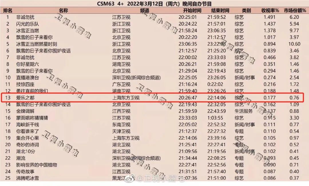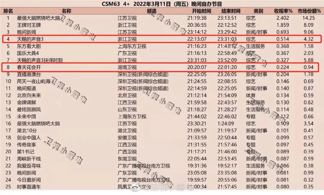 不仅网端热度遇冷,三档节目首播的收视数据也不乐观。CSM数据显示,《天赐的声音》第三季开播收视率仅0.514%,同日上线的《春天花会开》则在0.224%,而晚一天播出的《爱乐之都》收视率也只在0.177%。