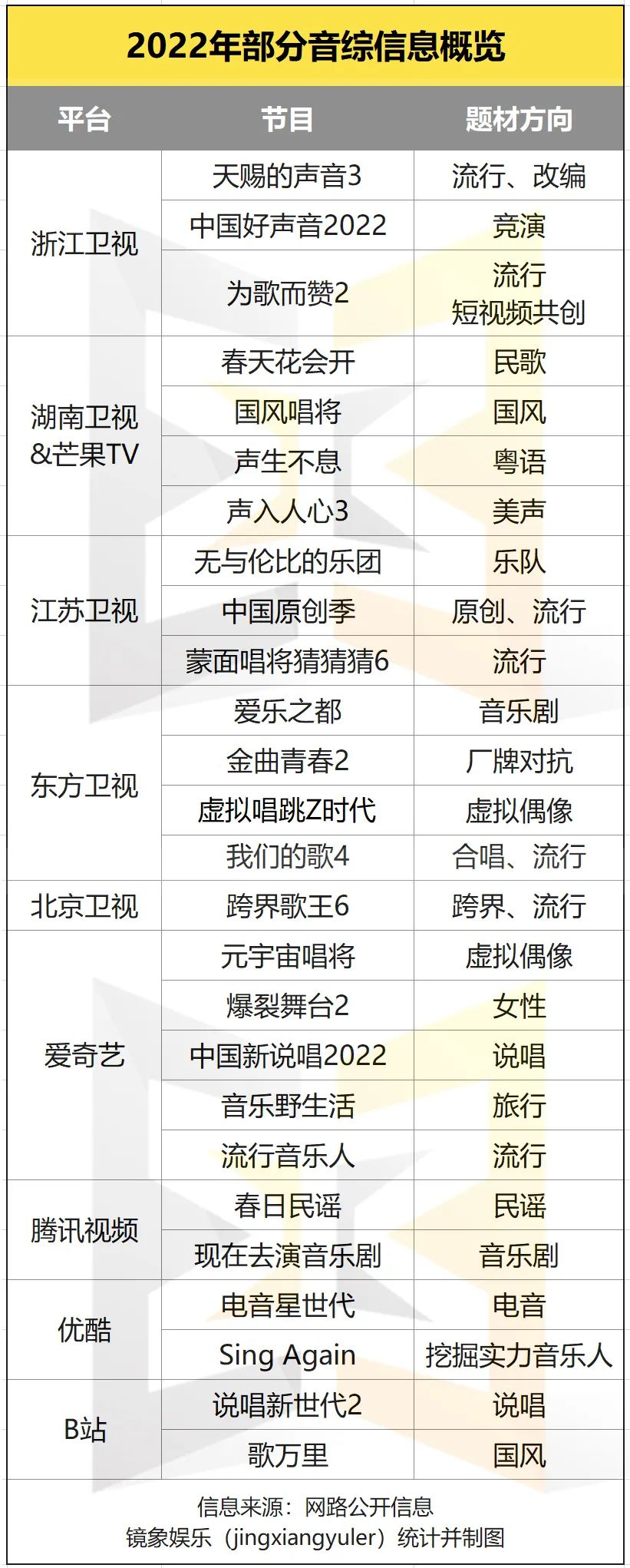 让人担忧的是,从今年各大平台的音综内容储备来看,当前正播出的几档音综的创作方向,基本折射出音综整体的布局方向稍显平庸。