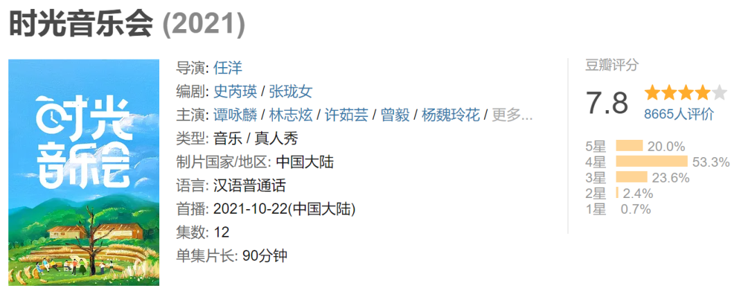 2021年,芒果TV曾推出《时光音乐会》,在豆瓣拿到7.8的高分。相较大多音综以竞演为主的高压模式,该节目在音乐表演之外,也关注音乐背后的故事,呈现出慢综艺的治愈感。或许是受此影响,腾讯视频的《春日民谣》、爱奇艺的《音乐野生活》也在尝试以音乐+故事、音乐+旅行的方式“慢”下来。