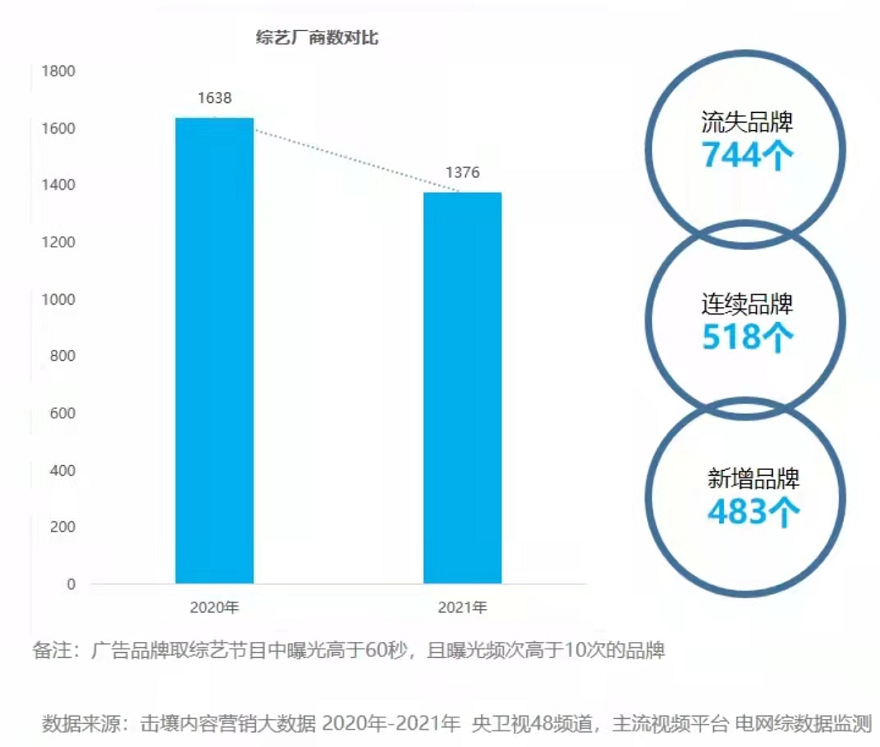 不仅是像《天赐的声音》这样的综N代,伴随着综艺市场整体招商环境变差,大多音综都面临着同样的难题。击壤科技发布的《2021综艺植入白皮书》数据显示,2021年,综艺的品牌赞助整体上流失了744个。