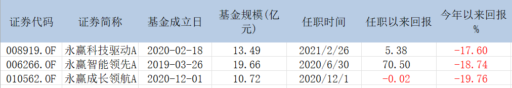 公开资料显示,于航是复旦大学运筹学与控制论专业博士,2010年7月至2020年3月在中海基金担任基金经理,2020年3月份加入永盈基金。自2020年6月份以来,于航先后接任了永赢智能领先、永赢科技驱动两只基金,加上2020年12月1日新发的永赢成长领航,于航已经管理3只基金,合计管理规模为43.87亿元。