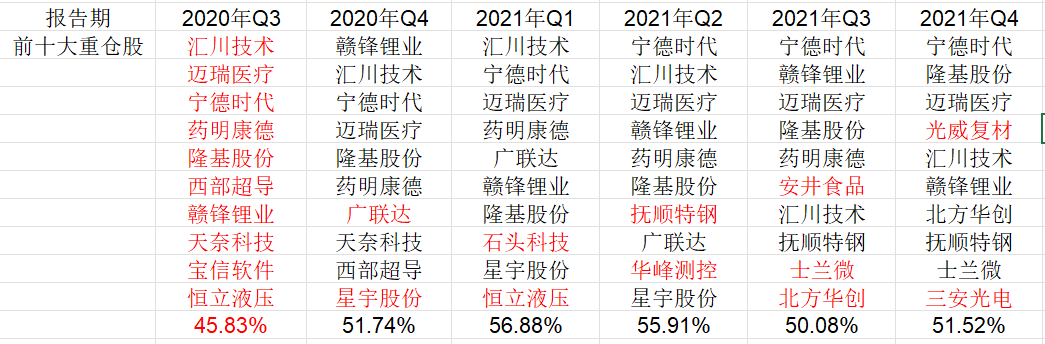 从2020年三季度至今,每个季度的重仓股保持更新2-3只的数量。2021年,该基金在重仓新能源的同时,逐渐新增了电子、钢铁煤炭、食品等行业。每个季度的前十大重仓股占比维持在50%-60%之间。