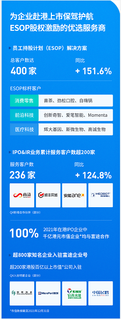 富途企业服务提供涵盖企业上市前后的一站式服务,包括一站式ESOP股权激励管理、投资者关系管理与PR以及IPO分销。其中,富途累计为236家企业提供IPO分销及IR服务,同比增长124.8%,富途ESOP股权激励管理服务截至Q4签约客户达400家,同步增长151.6%,合作企业包括前沿科技、生活消费、健康医疗等多行业的知名企业,如劲松口腔、自嗨锅等。2021年在港上市的所有新股中,千亿港元以上市值(市值数据截至2021年12月31日)企业100%与富途合作,四季度上市的知名企业如商汤科技、顺丰同城、安能物流及微创机器人等,富途均为承销团成员,与中金公司、海通国际、美银证券等知名投行共同助力企业赴港上市。